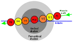 ![]() La Luna pasando de derecha a izquierda a través de la sombra de la Tierra (visto desde el hemisferio norte). | |