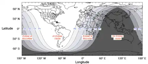 El siguiente mapa muestra las regiones desde las cuales fue posible ver el eclipse. En negro, las zonas que no observaron el eclipse; en blanco, las que sí lo vieron; y en gris, las regiones que pudieron ver el eclipse durante la salida o puesta de la luna.