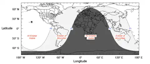 El siguiente mapa muestra las regiones desde las cuales pudo ser visible el eclipse. En negro, las zonas que no observaron el eclipse; en blanco, las que sí lo vieron; y en gris, las regiones que pudieron ver el eclipse durante la salida o puesta de la luna.