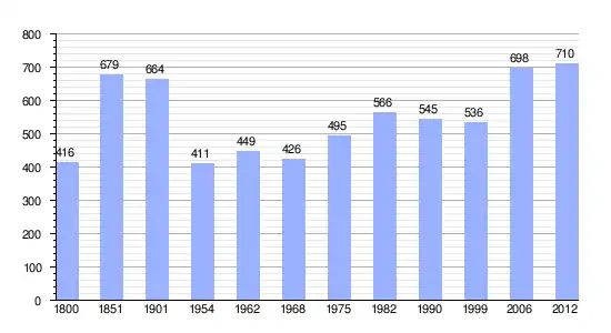 Los datos demográficos contemplados en este gráfico de la comuna de Eclose[4] se han cogido de 1800 a 1999 de la página francesa EHESS/Cassini, y los demás datos de la página del INSEE.[5]