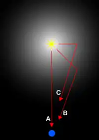 La luz reflejada que sigue el camino B llega a destino poco después que el destello directo que sigue el camino A y antes que la luz que recorre el camino C. Tanto B como C tienen la misma distancia aparente desde la estrella conforme a lo observable a partir de la Tierra.