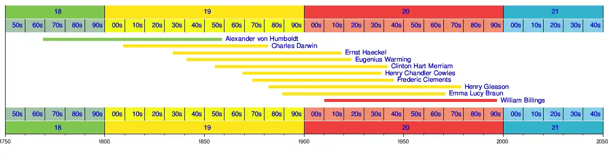 La ecología vegetal tiene su origen en la aplicación de la fisiología vegetal a las preguntas planteadas por los geógrafos de plantas.[9][10] : 13–16 Carl Ludwig Willdenow fue uno de los primeros en notar que climas similares producían tipos de vegetación similares, incluso cuando estaban ubicados en diferentes partes del mundo. El estudiante de Willdenow, Alexander von Humboldt, utilizó la fisonomía para describir los tipos de vegetación y observó que la distribución de los tipos de vegetación se basaba en factores ambientales. Los geógrafos de plantas posteriores que se basaron en el trabajo de Humboldt incluyeron a Joakim Frederik Schouw, A. P. de Candolle, August Grisebach y Anton Kerner von Marilaun. El trabajo de Schouw, publicado en 1822, relacionó las distribuciones de plantas con factores ambientales (especialmente la temperatura) y estableció la práctica de nombrar asociaciones de plantas al agregar el sufijo -etum al nombre de la especie dominante. Trabajando a partir de colecciones de herbario, De Candolle buscó reglas generales de distribución de plantas y también decidió usar la temperatura. : 14–16 El trabajo de dos volúmenes de Grisebach, Die Vegetation der Erde nach Ihrer Klimatischen Anordnung, publicado en 1872, vio a la geografía vegetal alcanzar su "forma definitiva" como un campo descriptivo. : 29