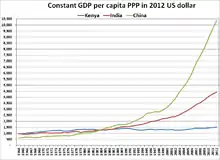 Después de la independencia, Kenia promovió un rápido crecimiento económico mediante la inversión pública, el fomento de la pequeña producción agrícola, e incentivos para la empresa privada (a menudo extranjeros), así como la inversión industrial. El producto interior bruto (PIB) creció a un promedio anual de 6,6% desde 1963 hasta 1973. La producción agrícola creció un 4,7% anual durante el mismo periodo, estimulado por la redistribución de tierras, la difusión de nuevas variedades de cultivos, y la apertura de nuevas áreas al cultivo.