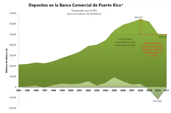 En la actualidad Puerto Rico tiene una deuda pública de $72 204 millones (equivalente al 103 % del PNB), un déficit gubernamental del $2500 millones (3,5 % del PNB), una participación laboral del 40 %, y una descapitalización progresiva de la banca comercial del 30 % (en comparación con los niveles de 2005), unos niveles de pobreza que arropan al 45 % de la población. En cuanto al mercado laboral se produjo una diáspora masiva, que entre los años 2010 al 2013 forzó la salida de más de 144 000 puertorriqueños.[26]