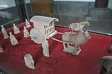 Otros artículos comunes incluían: consumibles (licor, pepinillos y salsas, ovejas y cerdos, granos, levadura para fermentación, pescado y abulón seco, dátiles, castañas, frutas y vegetales), materias primas (cuero de ganado, madera para embarcaciones, palos de bambú, tintes, cuernos, laca, cinabrio, jade y ámbar), vestimentas y materiales relacionados (telas de seda, telas finas y bastas, prendas de marta y piel de zorro, fieltro y felpudos, sandalias de piel de venado), utensilios de comida (cubiertos y palillos de bronce, plata y madera, y recipientes de hierro), objetos de arte (lacados, cerámica), ataúdes elegantes (hechos de catalpa, robinia, enebro y madera lacada), vehículos como carretas de dos ruedas y carros de bueyes pesados, y caballos.[94]