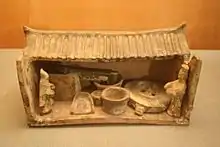 Los ladrillos en las paredes de las tumbas de los Han adinerados estaban adornados con relieves cincelados o moldeados y murales pintados; estos normalmente mostraban escenas de las fincas, salones, pozos, cobertizos para carruages, corrales para ganado, ovejas, pollos y cerdos, establos para caballos, y los empleados cosechando hojas de morera, arando la tierra, y azadonando los campos de vegetales.[107]