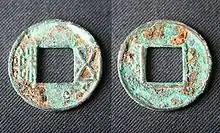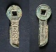 - Una moneda emitida durante los primeros años del reinado del emperador Wu de Han (r. 141-87 a. C.), hecha de plomo y acuñada antes de que se instaure el monopolio del gobierno; esta moneda tiene entre 22 y 23 mm de diámetro.