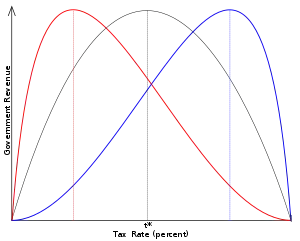 La curva de Laffer encarna un postulado de la economía de la oferta: que las tasas impositivas y los ingresos fiscales son distintos, con los ingresos fiscales del gobierno iguales a una tasa impositiva del 100% que a una tasa impositiva del 0% y los ingresos máximos en algún punto intermedio entre estos dos valores. Los partidarios de la oferta sostuvieron que en un entorno de tipos impositivos elevados, la reducción de los tipos impositivos daría lugar a mayores ingresos o pérdidas de ingresos menores de lo que cabría esperar basándose únicamente en estimaciones estáticas de la base impositiva anterior.[18]