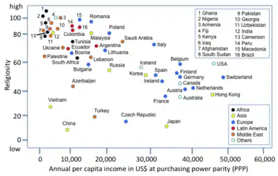 Los ingresos nacionales de los países están correlacionados negativamente con su religiosidad.[1]