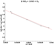 ![]() Gráfico de Arrhenius: ln(k) respecto a 1/T |