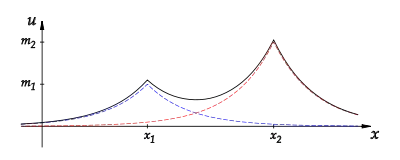 La evolución de las posiciones individuales peakon and , así como la evolución de las amplitudes peakon and Sin embargo, es menos trivial: esto se determina de una manera no lineal por la interacción