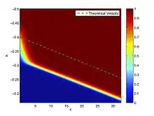 O sea, la solución cambie de un estado de equilibrio u = 0 a un estado de equilibrio u = 1. No existe tal solución por c < 2.[1][2][3] La forma de la ola por una velocidad de ola ya dada es único. Las soluciones por las olas que viajan están estables en contra de perturbaciones en el campo cerca pero no a perturbaciones del campo lejos, las cuales pueden hacer más gruesa la cola. Usando el principio de comparación y la teoría que todas las soluciones con datos iniciales compactos convergen a olas con la velocidad mínima.