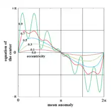 Excentricidad orbital[15] | Ecuación del centro máxima (serie truncada como se muestra) | |||