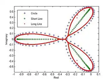 Los valores propios del sistema circular trazados en el plano complejo forman una forma de trébol. Los valores propios de una línea corta forman una Y lateral, pero los de una línea larga comienzan a parecerse a la forma de trébol del círculo. Esto podría deberse al hecho de que una línea larga es indistinguible de un círculo a aquellas especies alejadas de los extremos.