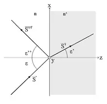 Cuando una onda electromagnética que se desplaza por un medio caracterizado por un índice de refracción , incide sobre la interfaz con otro medio que posee un índice de refracción , una parte de la onda se refleja y otra porción se transmite al otro medio. Las fórmulas de Fresnel dan una descripción completa y detallada del comportamiento de la onda, tanto en la onda que se refleja como en la onda que se transmite al segundo medio. La dirección de propagación de una onda electromagnética es siempre perpendicular a sus vectores eléctricos y magnéticos, por lo que uno de estos vectores debe estar en el plano de incidencia. Consideraremos que la onda electromagnética está polarizada elípticamente, ésta siempre va a poder expresarse mediante dos vectores perpendiculares en el plano de incidencia. Llamaremos al vector paralelo al plano de incidencia como y al vector perpendicular a éste plano como . Simplificando el problema, sin perder generalidad, podemos describir a estos vectores así:
