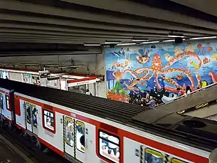![]() La estación con un tren detenido y uno de los murales pintados por Jorge Artus y los niños del taller de arte de la Teletón | |||||||||