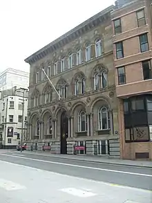 El edificio está construido en sillar, con sótano de granito y cubierta de pizarra. Tiene tres plantas más un sótano.[4] El estilo arquitectónico es de palacio veneciano,[1] pero empleando arcos como los realizados por Borromini en el Palacio Barberini de Roma. Tiene cinco tramos dando a la calle Chapel y siete dando al Covent Garden. En la planta baja hay ventanas con cabeceras redondeadas con columnas pareadas.[4] Entre los cabeceros de las ventanas hay medallones con bustos en relieve de personas involucradas en la exploración de las Américas.[1] Entre estos están Cristóbal Colón, Isabel la Católica, Rodrigo Bermejo (otro nombre dado a Rodrigo de Triana), Américo Vespucio, Hernán Cortés, Anacaona y Francisco Pizarro.[2] En el segundo piso hay ventanas más pequeñas de dos luces debajo de arcos de medio punto, separadas por columnas jónicas. El piso superior contiene ventanas de dos luces aún más pequeñas bajo arcos de medio punto entre pilastras paneladas. A lo largo de la parte superior del edificio hay un friso y una cornisa. El edificio está registrado en la Lista del Patrimonio Nacional de Inglaterra como un edificio catalogado de Grado II, habiendo sido designado el 12 de julio de 1966.[4]