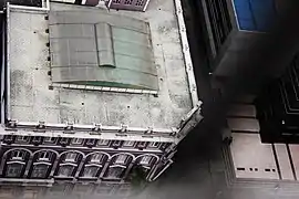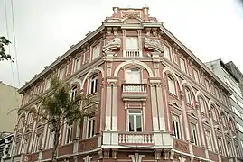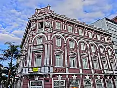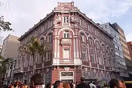 El edificio es de planta cuadrada ubicado en la esquina de una manzana, posee un acceso lateral a un patio central cubierto, rodeado por un corredor con columnas, por él se accede a oficinas que dan a la calle y otras laterales, escaleras y al cuarto nivel. Constructivamente la fachada y muros interiores son en mampostería, estructura en concreto armado, el entrepiso en placa y madera, cubierta en placa de concreto (terraza) y fíbrocemento, marquesina en estructura metálica. Posee algunas frescos (pinturas) en el interior descubiertos y semi-destruidos obra de Colombo Ramelli, quien igualmente remato el ochavado con un frontón circular interrumpido, con las dos esculturas en mármol de Carrara que representan a Minerva y Mercurio.