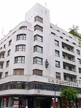 El edificio fue proyectado por el arquitecto bilbaíno Manuel Galíndez en 1932 como sede social de la compañía de seguros La Equitativa y como viviendas. Forma parte de la obra de su etapa racionalista, junto con los edificios de Seguros La Aurora (1934) o de la Naviera Aznar (1943).[1]