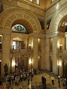 En las cuatro esquinas del vestíbulo central, hay estatuas de Itagaki Taisuke, Okuma Shigenobu, y Ito Hirobumi, que fueron fundamentales para establecer el gobierno constitucional en Japón, y un pedestal vacío. No está claro por qué hay un pedestal vacío. Algunos afirman que los diseñadores originales no pudieron llegar a un consenso sobre qué estatua construir, o que encapsulaba la idea de que la política nunca está completa. Otros dicen que los diseñadores lo dejaron abierto para instar a los políticos de hoy a superar a sus tres grandes predecesores, o que evitaron construir una estatua de espaldas al palacio imperial. El pedestal vacío se exhibe con un gran bonsái de pino el primer día de la sesión de la Dieta.