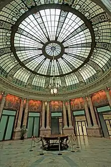La rotonda monumental está cubierta por una vidriera en forma de cúpula semiesférica, sustentada por doce pares de columnas dóricas de alabastro, que forman un dodecágono. La cúpula, realizada por la casa Maumejean, cuenta con motivos decorativos policromados. Del centro su centro cuelga una lámpara de bronce y cristal.[15] Lo más notable de la rotonda es la parte superior de los intercolumnarios, en la que Aurelio Arteta pintó doce murales de 2 por 3 metros cada uno. Los murales se pintaron utilizando las técnicas del fresco y el temple a la caseína[8] y presentan un relato que representa el ideal de la manera de ser vasca, cimentado en la abnegación, la tenacidad y el idealismo, no en vano se convirtió en símbolo de lo vasco en su conjunto:[8] El trabajo intelectual, El sembrador, La recolección, Las cargadoras del muelle, Los descargadores, El astillero, La fundición, El ferrocarril, La arribada del pesquero, Pescadores en el muelle, La mina y Las artes. El conjunto se conoce como El esfuerzo, título de un poema del belga Emile Verhaeren, publicado en español en 1919 y que tuvo mucha influencia en el País Vasco. Todos los frescos se basan en algunas de las estrofas de Verhaeren.[16]