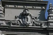 Influido por la monumentalidad y volumetría del cercano diseño de Antonio Palacios para la sede del Banco Español del Río de la Plata,[12] Bastida proyectó una fachada principal de carácter monumental, simétrica y de tres crujías. Se compuso con columnas, capiteles y entablamentos de órdenes clásicos gigantes.[13] Ocho columnas, de tres pisos de altura, dividen verticalmente la fachada, coronada por una balaustrada y dos torreones de unos cinco metros de altura. En la base de cada uno de los torreones, delante de la balaustrada, se encuentran dos atlantes de mármol italiano, esculpidos por Quintín de la Torre. Sobre cada torreón se encuentra una cuadriga, obra de Higinio Basterra. Las cuadrigas eran arrastradas cada una por cuatro caballos, cuyas pata sobresalen de la fachada, sobrevolando la acera. Las cuadrigas estaban realizadas en una aleación de bronce, plomo y hierro, con un recubrimiento de latón dorado. Fueron fundidas en la fundición madrileña Codina Hermanos[14] y cada una de ellas pesa 12,5 toneladas y tiene cuatro metros de altura.[2] Los aurigas no se encuentran en el interior de la cuadriga, sino que aparecen de pie, en un pedestal situado sobre el carruaje, de forma que puedan verse desde la calle.