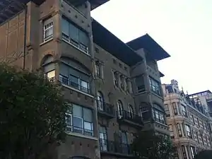 En el muro interior se abren cinco ejes de vanos, los del primer piso con decoración vegetal en barandas de forja y dintel superior; los del segundo, arqueados en cuello de barco, con similar decoración; y en el tercer piso con vanos de cuello de barco sin decoración sobre su dintel, tramo que ocupa un friso corrido que da paso a la mansarda que se divide en dos sectores, por una parte la formada por los remates de los miradores que crean un balcón con balaustrada, y por otra, la de los cinco vanos rematados con frontón partido (que se corresponden con el paramento interior de la fachada).