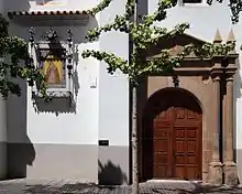 La portada de la fachada principal, de estilo clasicista y construida en el siglo XVII, llama la atención por estar hecha con mármol blanco. Tiene a ambos lados columnas estriadas apoyadas sobre pódiums y rematada en la parte superior con una estatua de San Agustín.