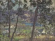 Los paisajes impresionistas de Edward Redfield se destacan por su audaz aplicación de la pintura y sus colores vibrantes. Redfield pintaba al aire libre, directamente de la naturaleza en lugar de en el estudio. Construía un empaste pesado, "de una sola vez" o en una sesión, generalmente al aire libre, a menudo bajo condiciones climáticas invernales brutales, amarrando la parte posterior de sus lienzos a menudo enormes a los árboles, para que no se los llevara el viento. Llegó a ser considerado como el principal pintor estadounidense de invierno del siglo XX, ganando más premios que cualquier otro pintor estadounidense, con la excepción de John Singer Sargent. Sus obras se expusieron en todo el país, y veintisiete de ellas se presentaron en la Exposición Internacional Panamá-Pacífico (1915) en San Francisco, que fue muy importante para los artistas de la época.