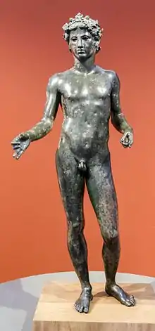 Se trata de una escultura realizada en bronce con la técnica de fundición en hueco. Representa a un joven desnudo de pie con una postura que remite al esquema en "S", característico de las formas praxitelianas, que se difundió a partir del siglo IV a. C. Responde al tipo iconográfico conocido como mellephebos stephebos o portador de guirnaldas, utilizado como figura decorativa en los banquetes romanos. Estilísticamente se data como copia neoática de la primera mitad del siglo I d. C. Presenta los brazos separados del cuerpo, en posición extendida, con los dedos de las manos en disposición para sostener algún objeto como una guirnalda o paño.