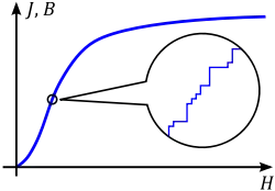 Estos saltos de la magnetización se interpretan como cambios discretos en el tamaño o la rotación de los dominios ferromagnéticos. Algunos grupos microscópicos de la energía atómica spin s en línea con el aumento de campo exterior de magnetización en tamaño por un repentino cambio de giros de vecinos y sobre todo en el campo magnetizante llega a ser relativamente fuertes, otros dominios de todo de repente se convierten en la dirección del campo externo. Al mismo tiempo, debido a las interacciones de canje de la gira tienden a alinearse con sus vecinos. La tensión entre los distintos tira crea avalanchas, donde un grupo de dominios de vecinos le dará la vuelta en una rápida sucesión para alinearse con el campo externo.