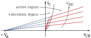 Las líneas tangentes a las de corriente de base, a voltajes altos, se extrapolan o alargan hacia atrás hasta tocar el eje X o de voltaje, esta intersección es el Voltaje de Early, normalmente se escribe con el símbolo VA.