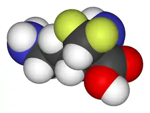 La eflornitina es un derivado de la ornitina especialmente activo contra tripanosomiasis africana, también conocida como la enfermedad del sueño, la cual se transmite a través de la picadura de la mosca Tse-Tse que le sirve de vector a un parásito conocido como T. b. gambiens. El fármaco actúa inhibiéndo la enzima ornitina decarboxilasa, una enzima caracterizada por participar en la síntesis de la poliamina[1] en un tipo de protistas denominados los tripanosomas, encargados de generar la enfermedad. La eflornitina tiene la capacidad de atravesar fácilmente la barrera hematoencefálica para penetrar en el líquido cefalorraquídeo y combatir la fase neurológica de la enfermedad que afecta todo el SNC, la eflornitina se elimina principalmente por los riñones.