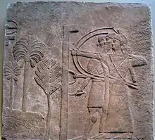La caballería era raramente utilizada por los asirios, mesopotámicos hasta el siglo IX a. C. cuando su uso es mencionado durante el reinado de Tikulti-ninurta II.[19] Antes de eso, muchos nómadas o guerreros esteparios se basaban en la caballería, que atacaron las tierras asirias. Los asirios tuvieron que contrarrestar esta forma móvil de guerra y para atacar a sus oponentes (en particular, a los iraníes) en su propio juego.[20] Quizá la mayor influencia exterior es la de los pueblos de Irán, los elamitas y los medos. Es irónico que la incursión de estos pueblos citados influyera a los asirios a crear una fuerza de caballería con la que destruir el reino de Elam. Sin embargo, los asirios al intentar usar esta fuerza por primera vez tuvieron dificultades. Los arqueros a caballo, no podían usar al mismo tiempo sus arcos y las riendas de sus caballos. Como resultado de ello, en la caballería de Asurnasirpal tuvieron que ir jinetes en pares, uno sosteniendo las riendas y el otro disparando con el arco.[19]