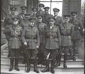 La mayoría de los oficiales de antes de la guerra venían de familias con conexiones militares, de gentry o de la nobleza; una educación de escuela pública era casi esencial.[52] En 1913, cerca del 2% de los oficiales regulares habían sido promovidos.[53] Los cuerpos de oficiales, durante la guerra, consistían en oficiales regulares del ejército de tiempos de paz, oficiales a los que les habían garantizado comisiones permanentes durante la guerra, oficiales a los que se les había garantizado comisiones temporales por lo que durara la guerra, oficiales del ejército territorial durante los tiempos de paz, oficiales comisionados de los rangos de antes de la guerra del ejército regular y territorial y oficiales temporales comisionados de los rangos para la duración de la guerra únicamente.[54]