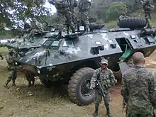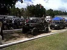 - Toyota Hilux con modificaciones con que se ven plenamente equipados con barras anti-volqueo, pedestales para ametralladoras, bancas de transporte y blindaje a los lados.
