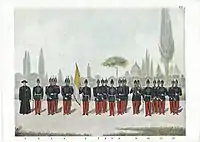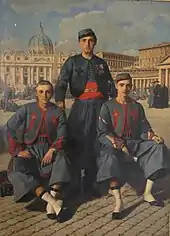 El ejército en 1870 estaba constituido de más de 13 000 efectivos (con más precisión, 13 624), de los cuales más de 8 300 estaban en el ejército regular y 5324 eran voluntarios extranjeros.[17] El ejército regular estaba compuesto de la siguiente manera: infantería, carabineros, cazadores, dragones y artilleros (que habían dado buena prueba de sí mismos en Mentana, con el respaldo de los aliados franceses de Napoleón III). Al batallón constituido de gendarmes boloñeses se añadieron dos escuadrones a caballo provenientes de la ciudad felsinea. Entre los italianos no faltaba ninguna de las familias de la aristocracia católica: el príncipe Pietro Aldobrandini, el príncipe Paolo Borghese, el príncipe Francesco Maria Ruspoli, el príncipe Vittorio Odescalchi, el príncipe Carlos Chigi Albani della Rovere, el príncipe Alfonso de Borbon-Dos Sicilias hermano del ex Rey de las Dos Sicilias; el príncipe Alfonso Carlos de Borbon-España y otros representantes de la nobleza europea. Los 5324 voluntarios constituyeron los regimientos de zuavos, de la Legión de Antibes y de Cazadores extranjeros.