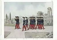 Con el establecimiento de la República Romana (1849), las tropas pasaron al servicio del nuevo Estado. Fue el ejército francés el que devolvió el trono a Pio IX. Después de la restauración del poder pontificio (julio 1849), el ejército papal fue disuelto formalmente. En el verano del mismo año Francia decidió mantener su propia guarnición para la defensa de Roma.
