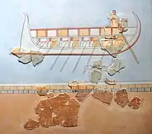 Los barcos micénicos eran embarcaciones de poco calado que se podían atracar en bahías arenosas.[81] Eran barcos de medidas diversas y tenían diferente número de remeros. El barco más grande probablemente tenía una tripulación de 42 a 46 remeros, con un timonel a cargo del timón de espadilla, un capitán, dos guardias y un grupo de guerreros.[82]