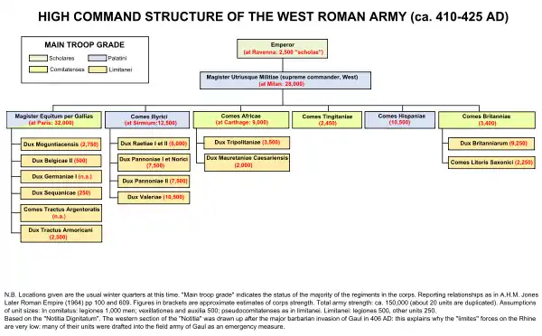 Según la Notitia, 10 de los 12 duces de occidente también reportaban directamente al magister utriusque militiae y no a sus comes regionales.[111][119] Sin embargo, esto no encaja con la situación en oriente y probablemente no refleja la situación real en 395 o incluso en 425. Habría sido claramente una organización muy poco práctica, dado que la falta de conexión entre los mandos habría hecho imposible la operación conjunta entre los comitatus y los ejércitos fronterizos. El periodo caótico entre 406 y 425 probablemente llevó a diversos cambios ad hoc en las relaciones entre los mandos en función de las necesidades del momento. Enfrentados con los confusos datos de borradores anteriores, los redactores finales de la Notitia presumiblemente decidieron en tomar la solución más simple, mostrando a todos los oficiales reportando directamente al magister utriusque militiae. Sin embargo, sí que sobrevive alguna traza de verdadera organización: la Notitia muestra a los duces de Caesariensis y de Tripolitania reportando al comes Africae.[111] El único dux que probablemente reportó directamente al magister utriusque militiae fue el dux Raetiae I et II, cuyas provincias pertenecían a la diócesis de Italia.