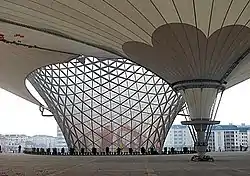 El techo tiene una cubierta hecha por una membrana plástica especial, hecha de fibra de vidrio recubierta con PTFE, con una superficie total de 65.000 m². Está sostenido por 50 mástiles (19 interiores y 31 exteriores) y por seis cuerpos centrales o columnas en forma de embudo de 45 m de altura y 80 m de proyección libre, cada uno con una superficie de cerca de 5.000 m².[2] Estas columnas, construidas con acero y cristal, se internan en los bajos, brindando luz y ventilación natural a los establecimientos de la zona baja.