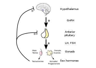 Estas dos hormonas juegan un papel importante en la comunicación con las gónadas. En las mujeres, la FSH y la LH actúan principalmente para activar los ovarios para que produzcan estrógeno e inhibina y para regular el ciclo menstrual y el ciclo ovárico. El estrógeno forma un bucle de retroalimentación negativa al inhibir la producción de GnRH en el hipotálamo. La inhibina actúa para inhibir la activina, que es una hormona producida periféricamente que estimula positivamente a las células productoras de GnRH. La folistatina, que también se produce en todos los tejidos del cuerpo, inhibe la activina y le da al resto del cuerpo más control sobre el eje. En los hombres, la LH estimula las células intersticiales ubicadas en los testículos para producir testosterona, y la FSH juega un papel en la espermatogénesis. Los machos solo secretan pequeñas cantidades de estrógeno. Investigaciones recientes han demostrado que existe un eje de neuroesteroides, que ayuda a la corteza a regular la producción de GnRH en el hipotálamo.[4]