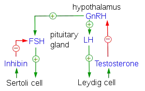 En los hombres, la producción de GnRH, LH y FSH es similar, pero los efectos de estas hormonas son diferentes.[8] La FSH estimula las células sustentaculares para que liberen proteína transportadora de andrógenos, que promueve la unión de testosterona. La LH se une a las células intersticiales y hace que secreten testosterona. La testosterona es necesaria para la espermatogénesis normal e inhibe el hipotálamo. La inhibina es producida por las células espermatogénicas, que, también mediante la inactivación de la activina, inhibe el hipotálamo. Después de la pubertad, los niveles de estas hormonas permanecen relativamente constantes.