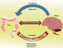 El eje intestino-cerebro, un sistema de comunicación neurohumoral bidireccional, es importante para mantener la homeostasis y está regulado a través de los sistemas nerviosos central y entérico y las vías neural, endocrina, inmunitaria y metabólica, y especialmente incluyendo el eje hipotalámico-pituitario-suprarrenal (Eje HPA).[1] Ese término se ha ampliado para incluir el papel de la flora intestinal como parte del "eje microbioma-intestino-cerebro", un vínculo de funciones que incluye la flora intestinal.[1][3][2]