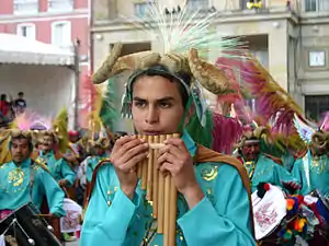Joven tocando una zampoña en el Carnaval de Negros y Blancos en Pasto.