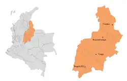 A esta parte de territorio comprende los departamentos de Cundinamarca, Boyacá, Santander y Norte de Santander. Muchas poblaciones han tenido un papel determinante en la apropiación y divulgación de estas músicas. Algunos de los eventos que más apoyan estas manifestaciones musicales son el Festivalito Ruitoqueño[5] en Floridablanca, Santander o en los múltiples "Aguinaldos" realizados en el departamento de Boyacá, durante épocas navideñas raíces.[6]