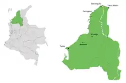 Este eje comprende los departamentos colombianos sobre el Caribe continental occidental, a saber Atlántico, Bolívar, Córdoba y Sucre, y además musicalmente las riberas del río Magdalena en los departamentos de Magdalena y Cesar. Sus prácticas musicales son la consecuencia de la mezcla de tradiciones europeas, amerindias y negras. Durante el siglo XX con el desarrollo de las big bands, varios de los géneros musicales fueron explorando nuevos rumbos, con diferentes instrumentaciones y variaciones melódicas y armónicas. El Carnaval de Barranquilla es uno de los eventos folclóricos en donde más se explotan los ritmos de este eje musical. De esta región proviene uno de los géneros musicales más conocidos de Colombia en el mundo: La cumbia.