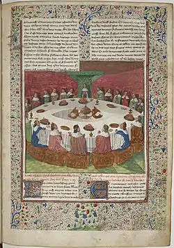 ![]() Los caballeros del Rey Arturo, reunidos en la Mesa Redonda para celebrar el Pentecostés, tienen una visión del Santo Grial. Imagen de portada del volumen 68 La visión abierta. Del mito del Grial al surrealismo de Victoria Cirlot. | ||