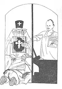 ![]() Nikolái Bujarin con la "Biblia comunista" (El ABC del comunismo). | ||