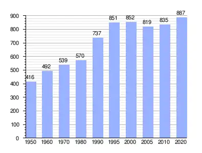 En 2020 registró una población de 887 personas, lo que corresponde al 4.69 % de la población municipal.[12] De los cuales 420 son hombres y 467 son mujeres.[12] Tiene 2146viviendas particulares habitadas.[12]